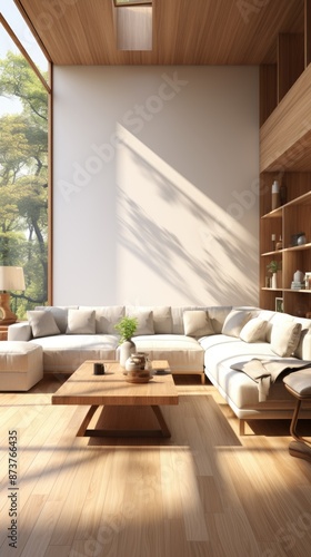 © Ghulam, Fototapeta premium a living room with a couch, a table, and a plant on the table.