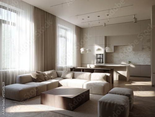 © Bouchra, Fototapeta premium A living room with a couch, coffee table, and ottoman
