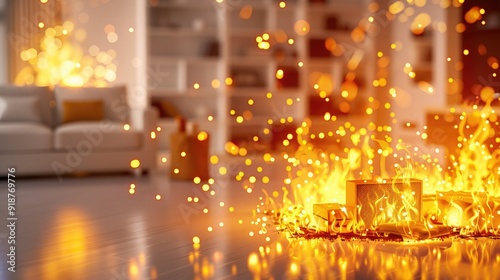 © WACHI, Obraz premium A living room with a cozy fireplace surrounded by candles and decorative lights, creating a warm and inviting atmosphere in the evening.