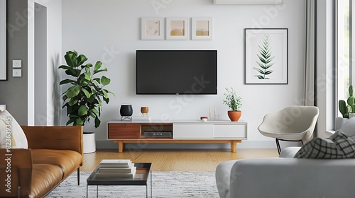 © PhornpimonNutiprapun, Obraz premium A living room with a flat-screen TV mounted on the wall.