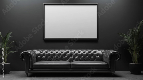 Fototapeta premium a living room with a leather sofa and a blank poster frame on a black wall