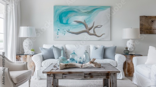 © Beyonder, Obraz premium A living room with a serene ocean theme, featuring sea glass decorations and soft blues, creating a peaceful, maritime-inspired oasis for relaxation and inspiration.