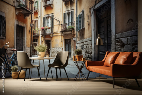 © msroster, Naklejka premium a living room with a wall mural of a street scene