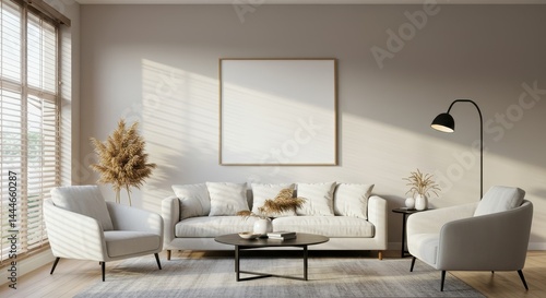 Fototapeta premium A living room with a white sofa, two armchairs, a coffee table, and a blank picture frame on the wall