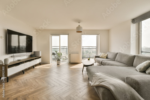 © Casa imágenes, Fototapeta premium a living room with wood flooring and large windows looking out onto the cityscapea is on the wall