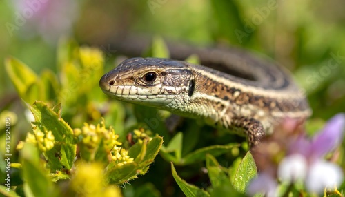 © Kabel, Naklejka premium A lizard among vibrant wildflowers