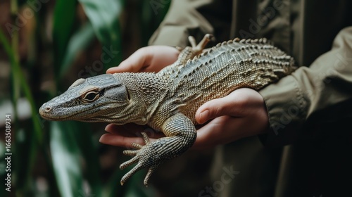 © shobakhul, Obraz premium A lizard held gently in two hands.
