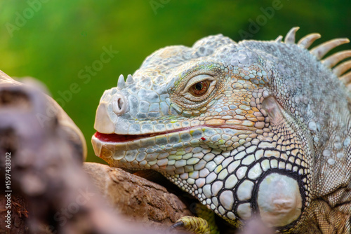 Fototapeta premium A lizard is laying on a rock with its mouth open