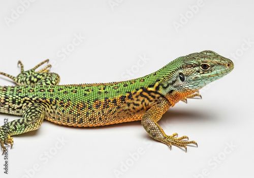 Fototapeta premium A lizard, positioned in the center-left of the image, is captured against a plain, off-white backdrop