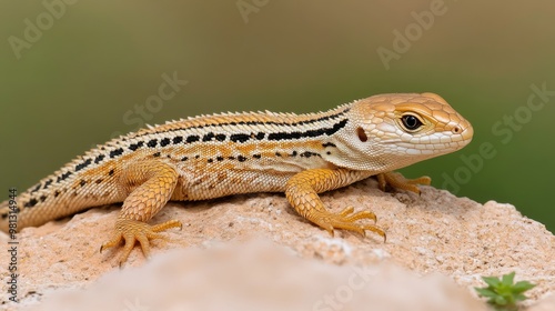 © lililia, Naklejka premium A lizard rests atop a pile of rocks in the desert, soaking up sunlight while highlighting its beautiful black striped pattern and the surrounding arid landscape