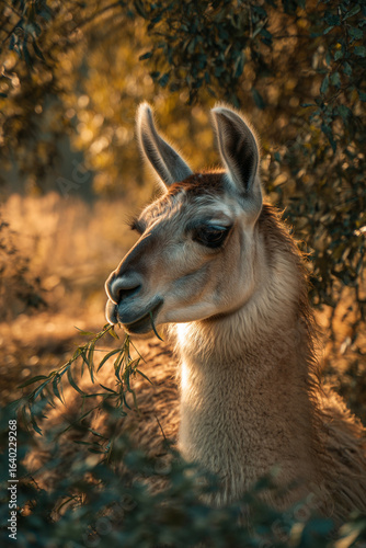 © Vitali, Obraz premium A llama chewing peacefully on green grass while golden sunlight filters through surrounding tree leaves.