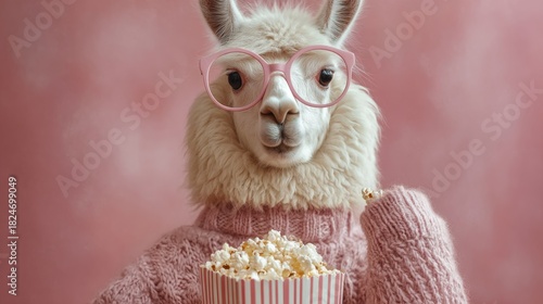 Obraz premium A llama clad in a soft pink sweater and glasses munches on popcorn while...