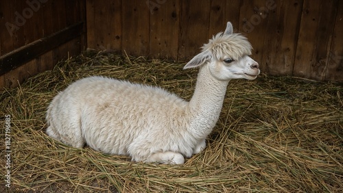 © Sona, Obraz premium A llama resting on straw inside a wooden enclosure.