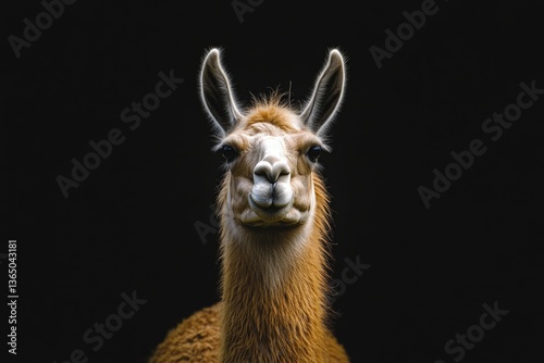 © Lindamar, Obraz premium A llama stands out vividly against a dark, black backdrop, creating a striking contrast.