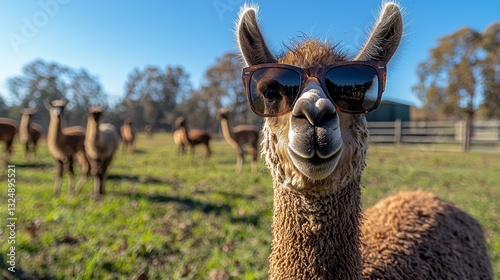 © Mikus, Obraz premium a llama wearing sunglasses standing in a field surrounded by a fence, trees, and a house in the background, with a clear blue sky above