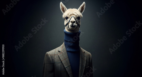 Fototapeta premium A llama with glasses and suit on dark gradient background, showcasing...