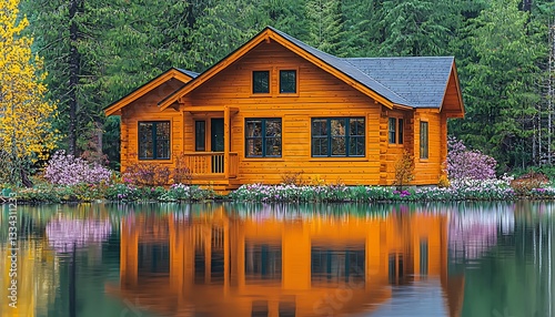 © Wahyu, Fototapeta premium A log cabin home reflects beautifully in the tranquil water