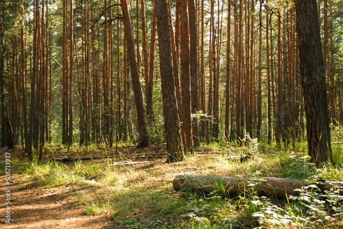 Naklejka premium A log in the foreground and a large number of pine trees in the background are illuminated by sunlight in a coniferous forest