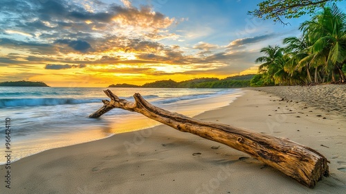 Obraz premium A log rests on a sandy shore beside the ocean during sunset, with palm trees...