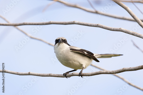 Fototapeta premium A loggerhead shrike (Lanius ludovicianus), a small bird with black, grey and...