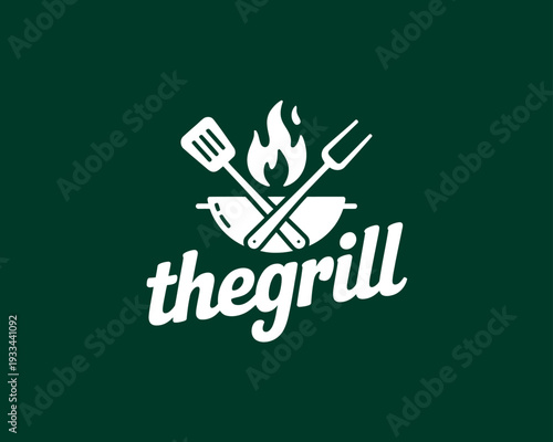 © Manaor, Obraz premium A logo for a grill restaurant with a spatula, fork, and flame design on a dark green background