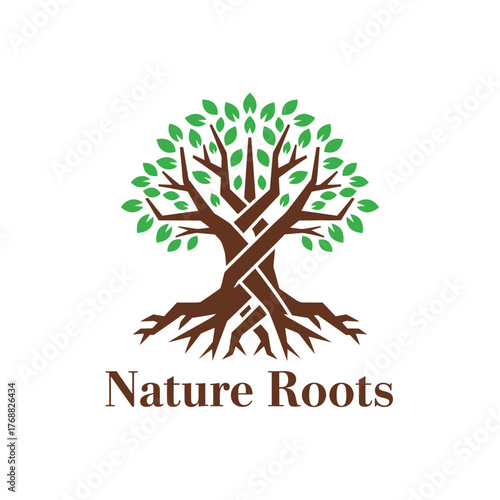 Obraz premium A logo of a stylized tree with intertwined trunk, roots, green leaves, and...