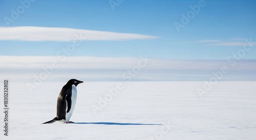 Fototapeta premium A lone Adelie penguin stands on a snow-covered landscape with a clear blue...
