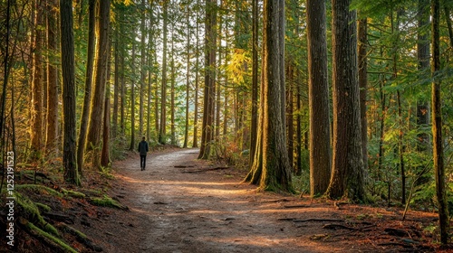 Fototapeta premium A lone adventurer walking along a forest path, surrounded by tall trees and natural beauty.