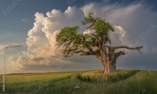 Obraz premium A lone, ancient tree stands amidst a vast field under a dramatic sky