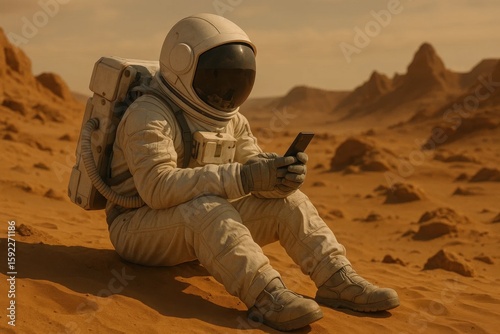 Obraz premium A lone astronaut in white suit sits on Mars, engrossed in their phone amidst...