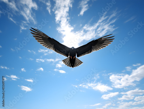 © TatjanaMeininger, Fototapeta premium A lone bird soaring high against a vast expanse of a clear, bright blue sky
