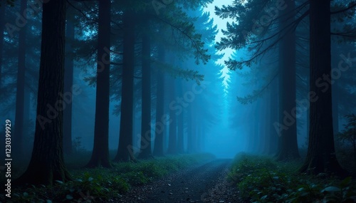 Obraz premium A lone blue spotlight shines through the trees in a dense forest, isolated,...