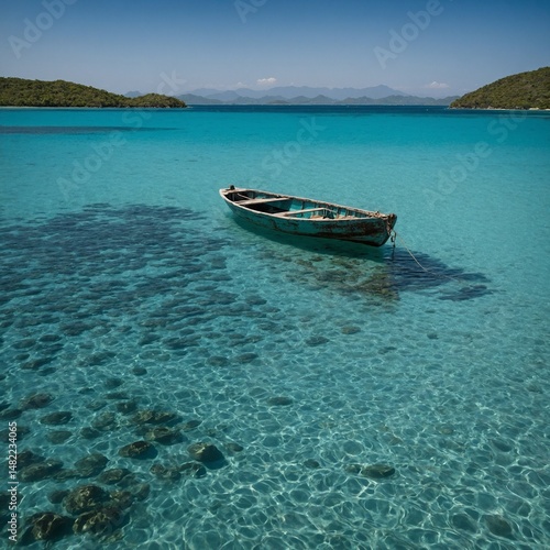 Naklejka premium A lone boat on a turquoise bay, with shimmering ripples and distant islands.