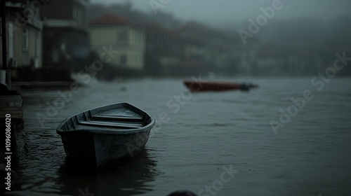 © Javid, Naklejka premium A lone boat sits on the water in a harbor on a stormy day.