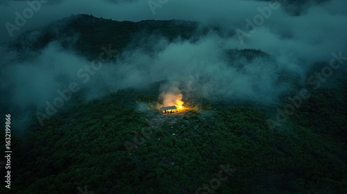 Obraz premium A Lone Bonfire's Warm Glow Pierces the Misty Twilight on a Remote Forested Hill