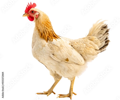 © Muhammad, Fototapeta premium A lone brown farm hen stands on a white background, a studio shot capturing the isolated poultry bird