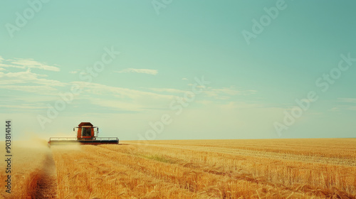 Fototapeta premium A lone combine harvester works through a vast golden wheat field under a clear, expansive blue sky, emblematic of rural serenity and agricultural productivity.