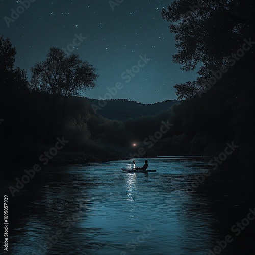 © lasmi, Fototapeta premium A lone couple paddle a canoe under a starry night sky, illuminated by a lantern.
