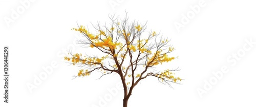 Fototapeta premium A lone deciduous tree, branches reaching skyward, stark white background,...