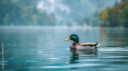 Fototapeta premium A lone duck swims across a calm lake, surrounded by misty mountains and a...