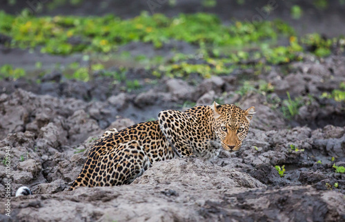 Obraz premium A lone female leopard (Panthera pardus pardus), pausing and looking at the camera at a waterhole in fading evening light, South Luangwa National Park, Zambia, Africa.