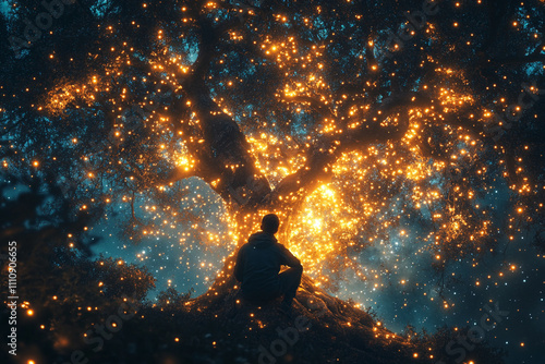 © Myartsam Design, Obraz premium A lone figure contemplates a luminous tree at night