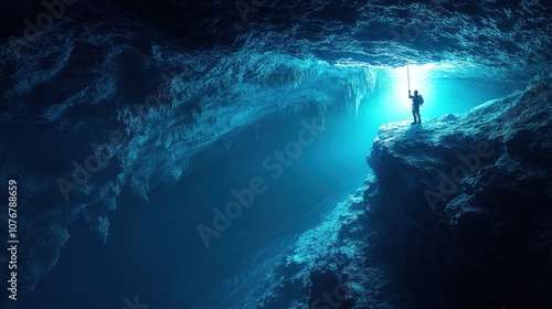 Obraz premium A lone figure explores a luminous cave filled with blue light.