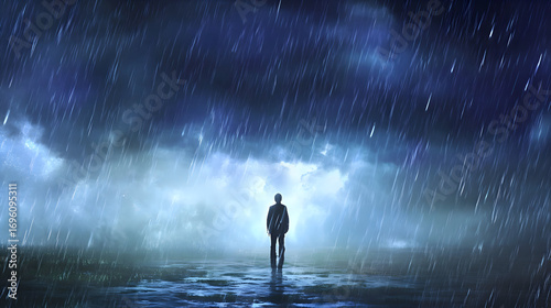 Fototapeta premium A lone figure standing in a rainstorm, but only they are getting wet while...
