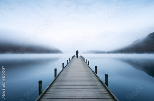 Naklejka premium A Lone Figure Standing on a Foggy Pier, Surrounded by Calm Waters and Misty...