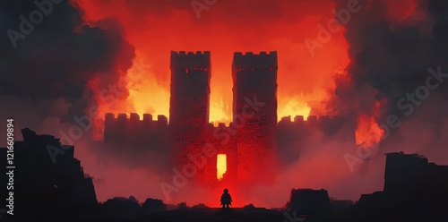 © RizArt, Obraz premium A lone figure stands before a fiery castle ruin