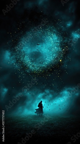© isti, Obraz premium A lone figure stands before a glowing celestial ring in the night sky, in ethereal, atmospheric setting