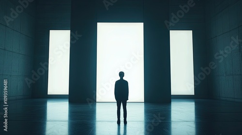 Obraz premium A lone figure stands before illuminated doorways in a vast hall