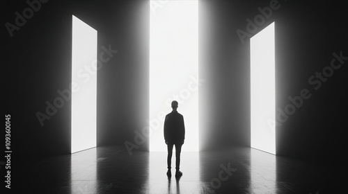 Obraz premium A lone figure stands before three bright doorways