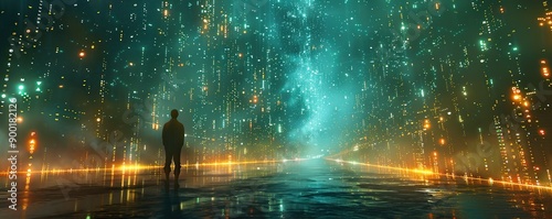 © ali, Naklejka premium A lone figure stands in a futuristic city with glowing lights and a shimmering sky.